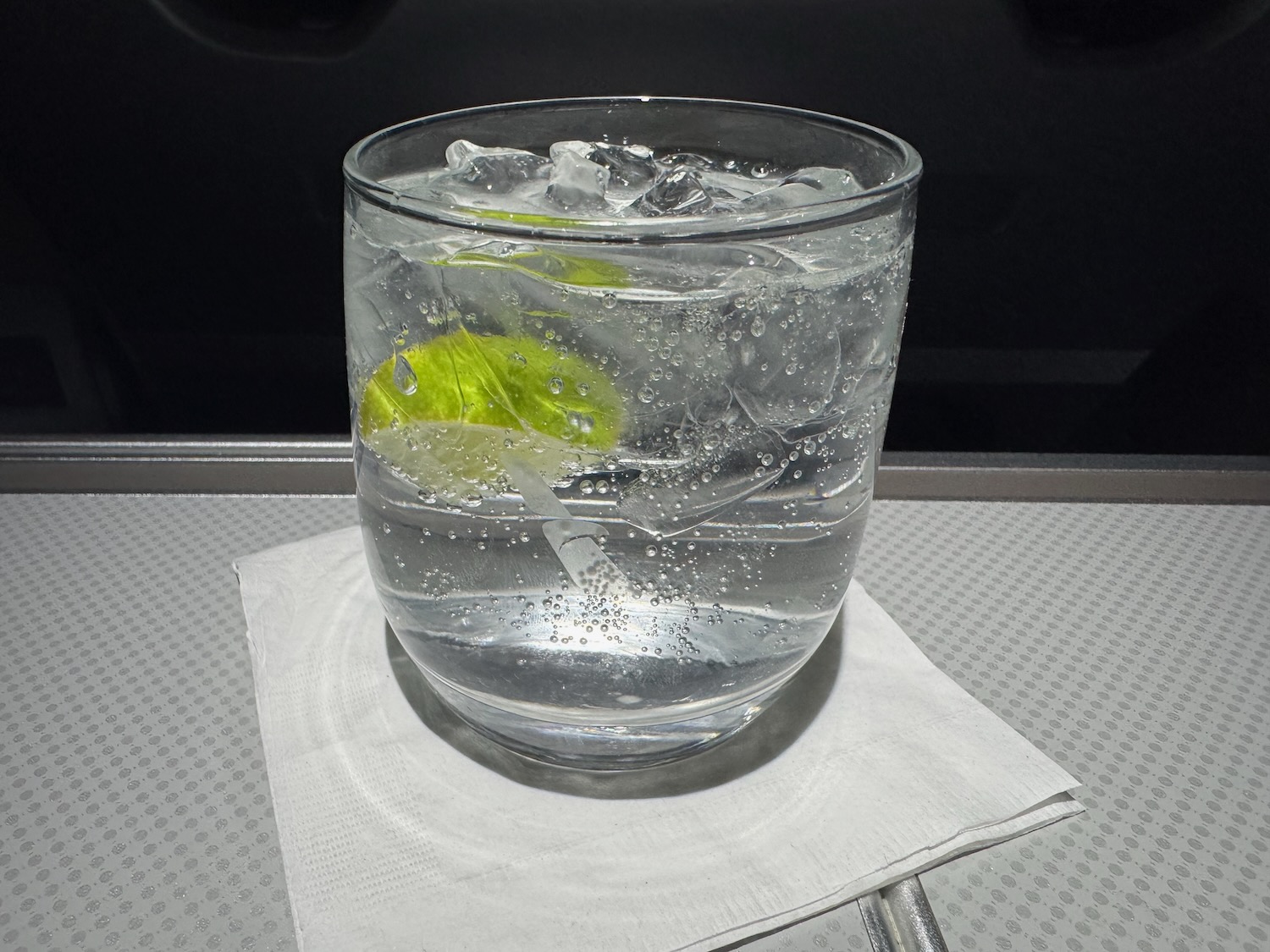 Dinner began with a choice of beverage and warmed mixed nuts…another “comfort food” I quite enjoy, especially because the AA mix includes pecans and pistachios. To drink I had club soda, which is no longer provided by Canada Dry (the new brand is Q Club Soda, which has a touch of Himalayan sea salt).
