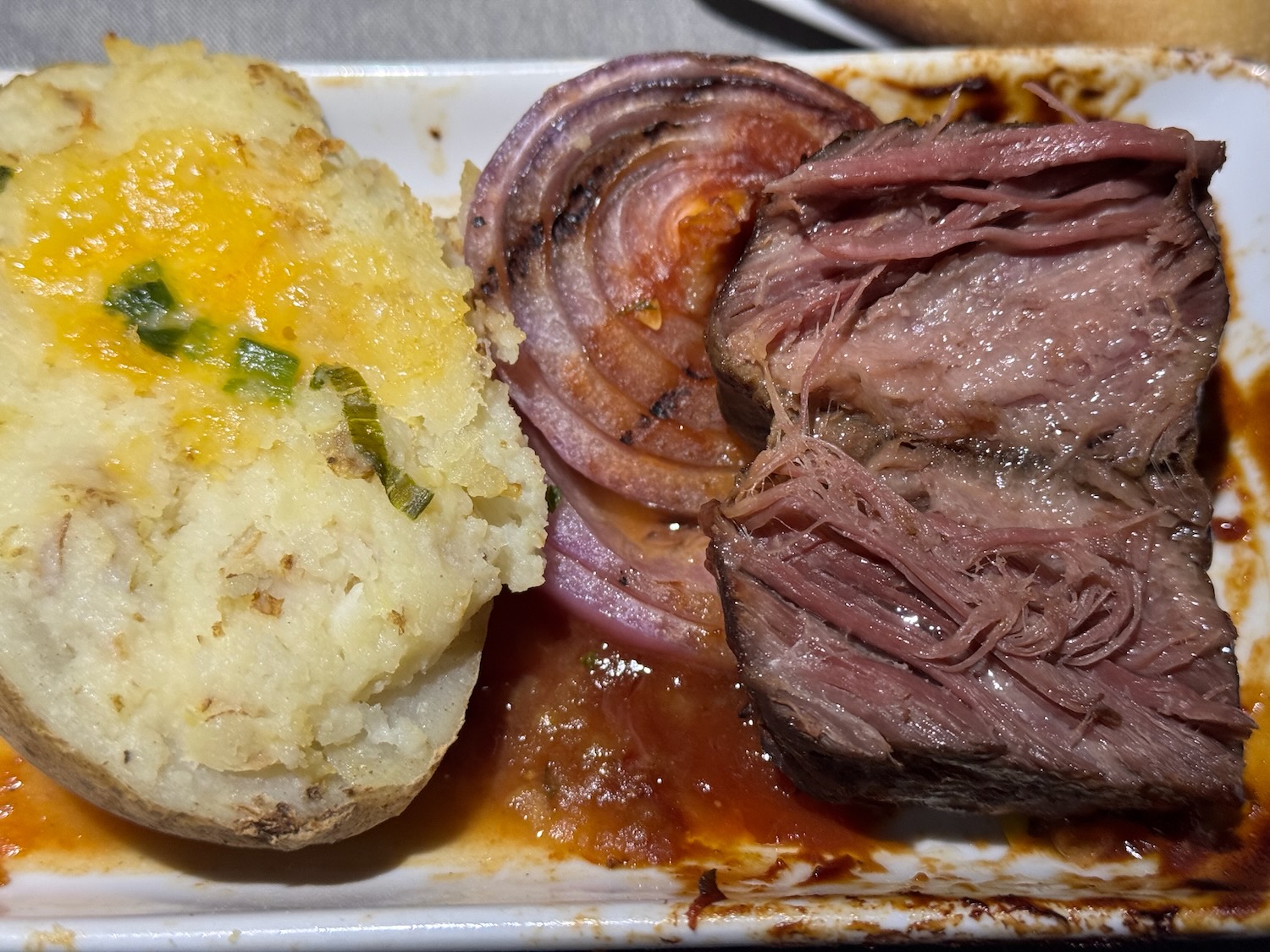 The main course wasn’t pretty (it had splattered all over the casserole dish), but it was delicious…not a high-quality cut of meat by any means, but extremely tender and the “steakhouse” BBQ sauce was a nice mix of tangy and sweet. The twice baked potato was a great addition and even the grilled onions paired well and were not too strong.