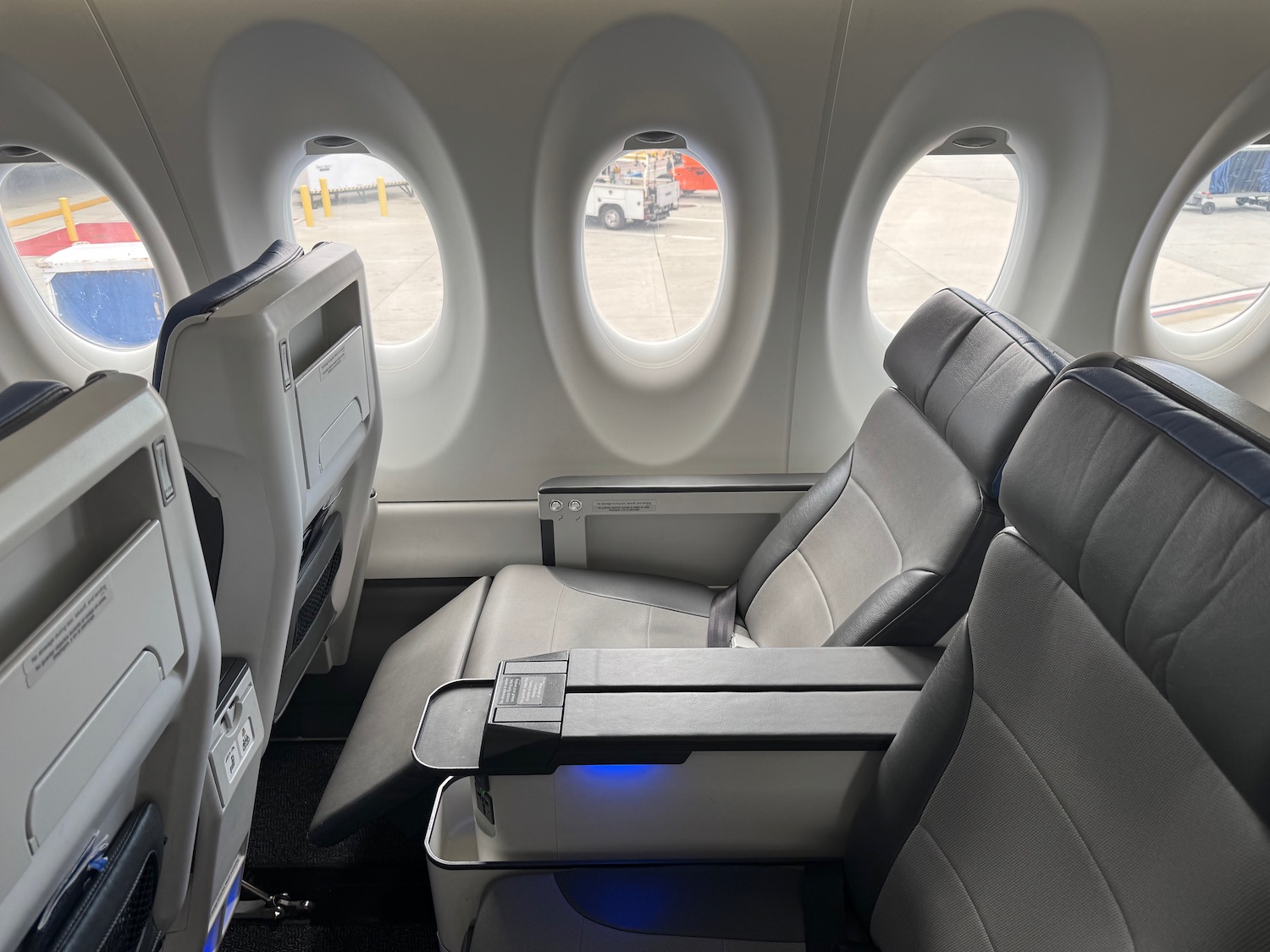The front-cabin on Breeze used to be called “Nicest” class but is now called Ascent. Breeze uses Airbus A220 aircraft with 2-2 seating in business class (same seat as my Bulgaria Airlines A220 flight last year).