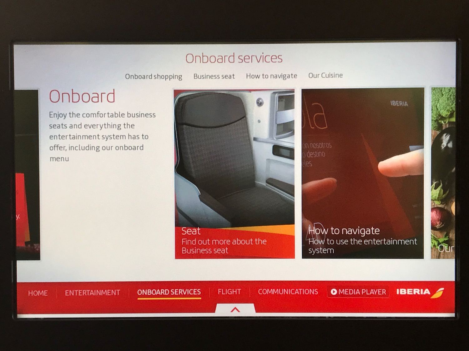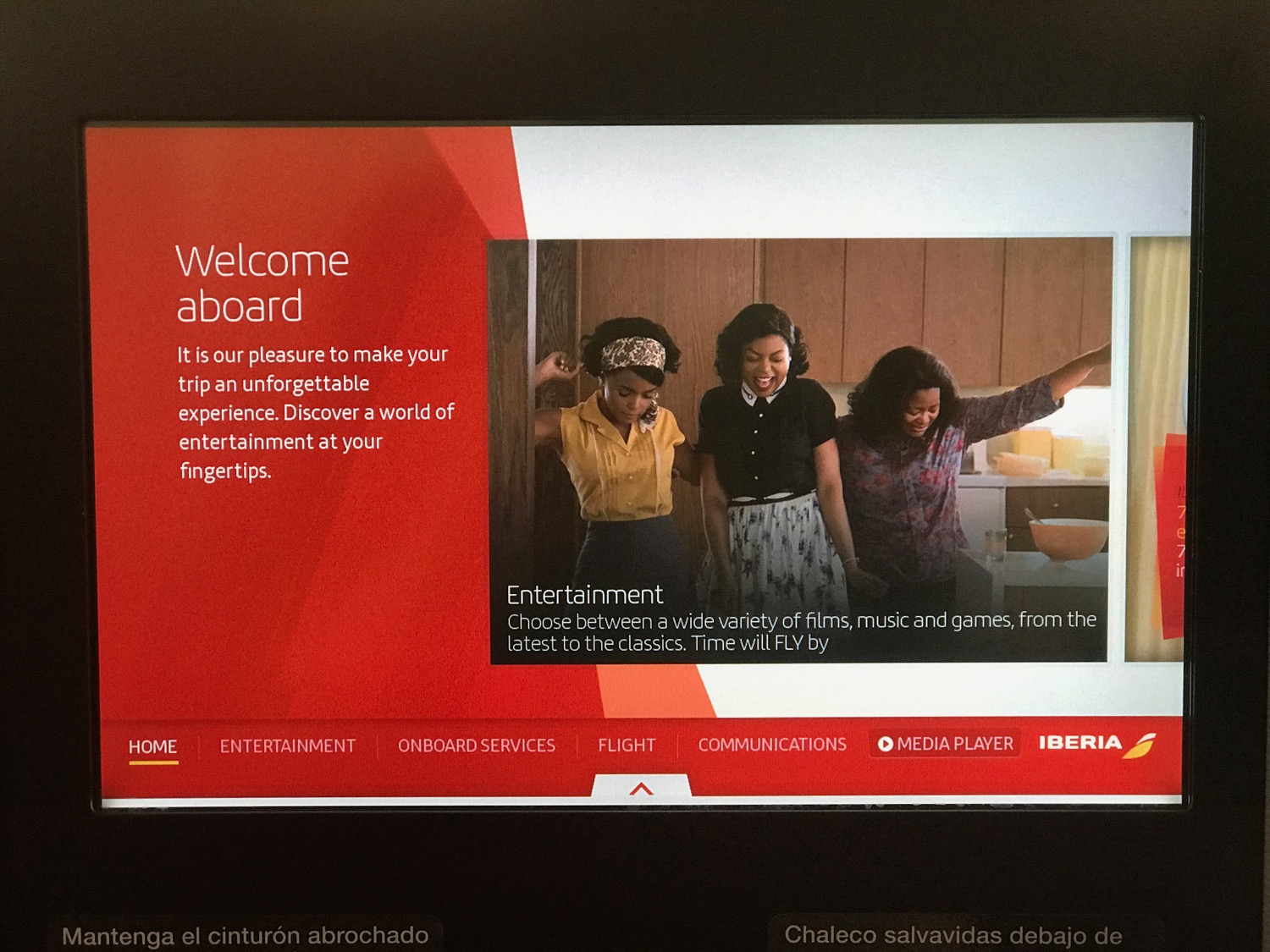 The full IFE system was turned on for the 2.5hr flight to Madrid. Choices included a number of box-set TV programs, movies, games, and music. The layout of the IFE system was very easy to use and aesthetically pleasing. Unfortunately, the noise-cancelling headphones were the type that hurt your ears after wearing them for more than a few minutes.