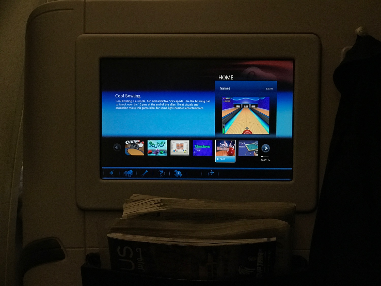 IFE movie choices were not as comprehensive as ICE on Emirates or KrisWorld on Singapore, but there were at least a dozen western movies plus TV programming, music and games. Headphones are very cheap and not acceptable for international business class.