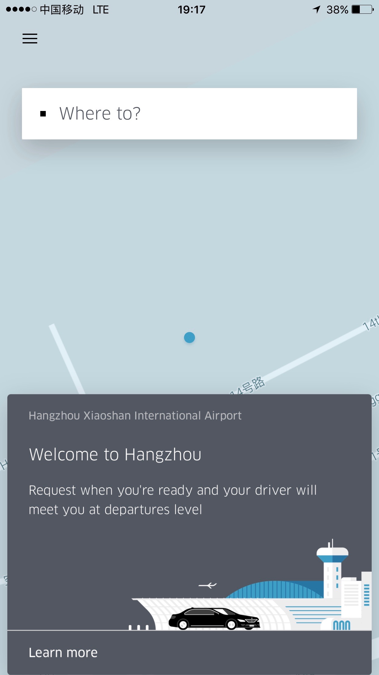 Uber is technically available in Hangzhou, but no drivers were found. After 15 minutes of waiting I just hopped into a taxi. Metered taxies tend to be cheap in China and Hangzhou is no exception.