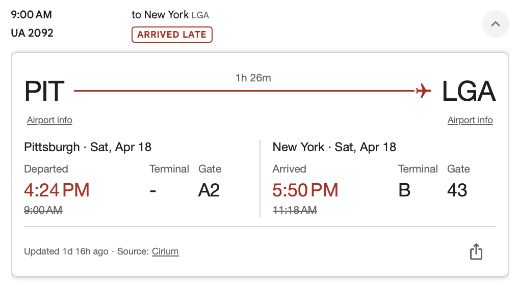 You could really do some basic journalism. If you search the N number for the plane it did NOT carry on to LGA as you imply. It spent all day in PIT then was ferried back to ORD at night. Repaired overnight. A different AC was flown into PIT to continue to LGA. https://www.flightaware.com/live/flight/N37325