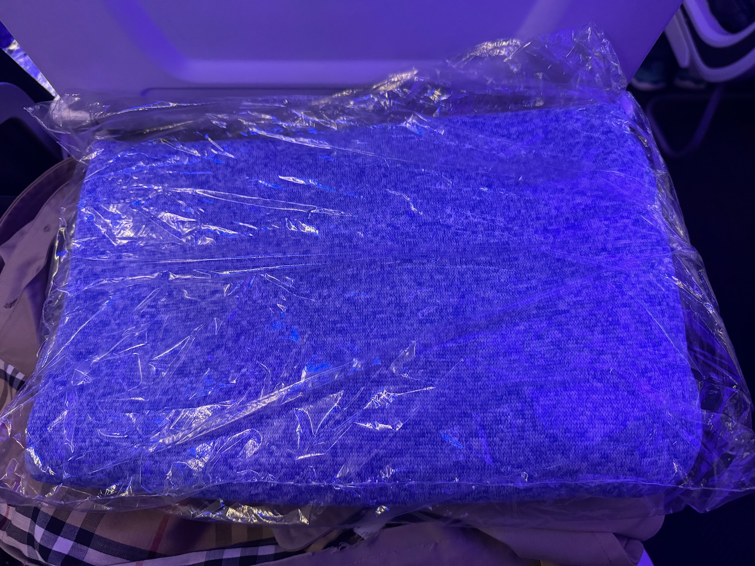 Our flight featured United’s new blankets, which are light blue instead of dark blue, and much thicker…a big upgrade over the see-through “gauze-like” blankets we’ve had in economy class and domestic first class for as long as I can remember. United does not offer pillows on domestic redeye flights.