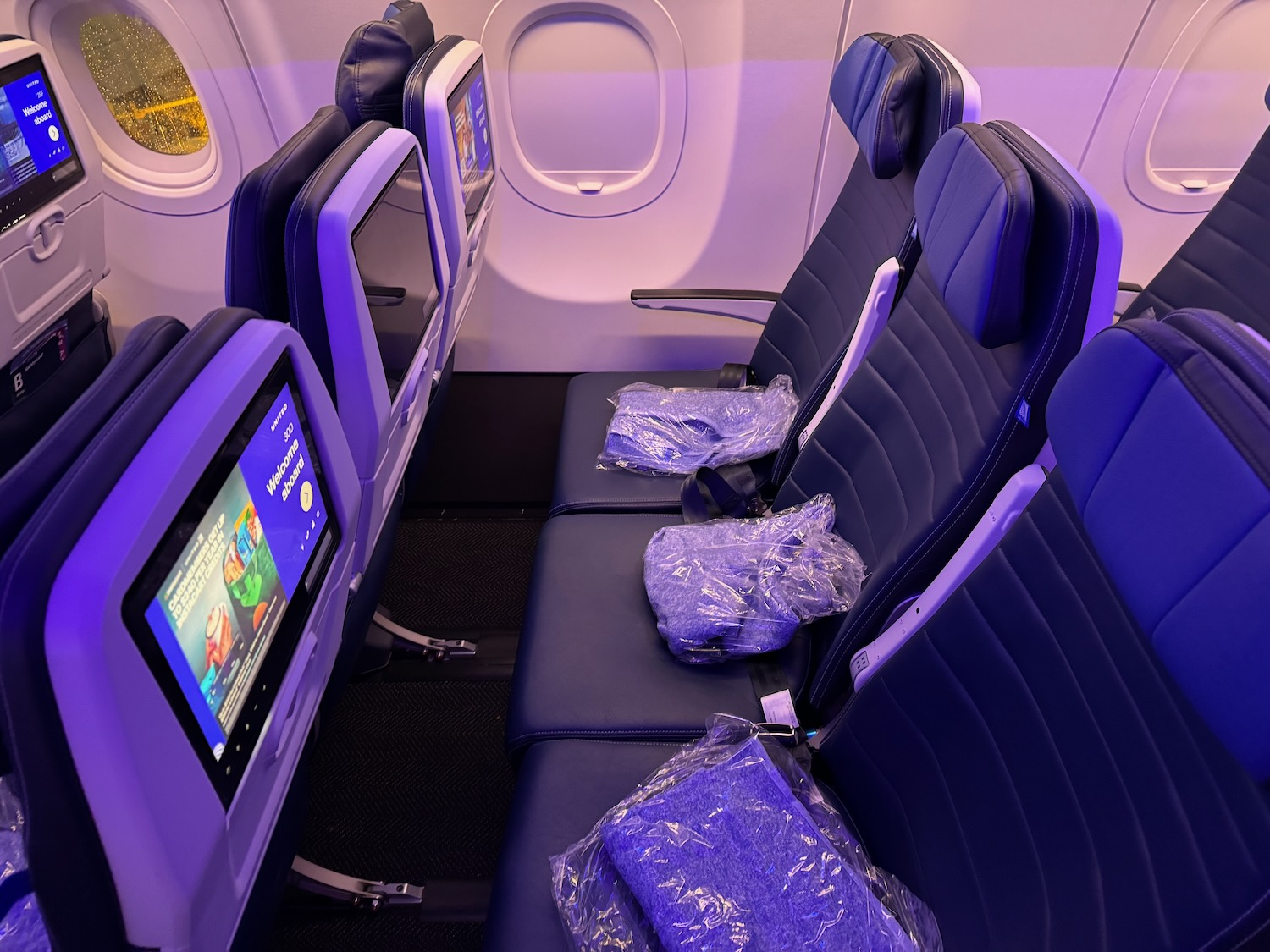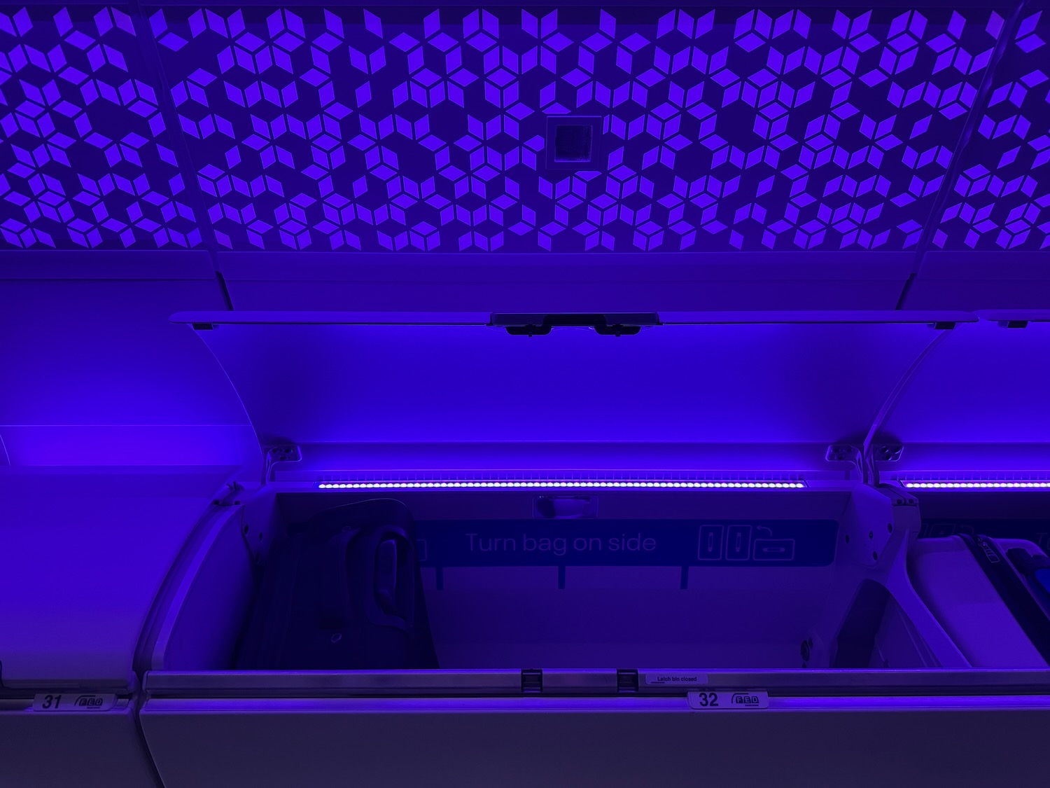 Each seat has a USB-C socket below the monitor and there are two A/C power outlets for every three seats. There are also air vents overhead. Larger overhead bins allow everyone to bring onboard one larger carry-on bag.