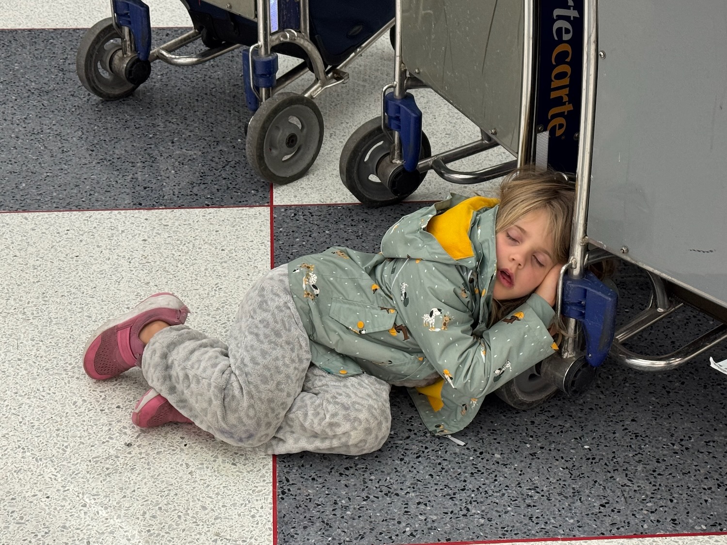 My kids were also asleep and poor Claire Marie fell asleep leaning against the carry-on bag and then curled up on the floor in the baggage claim area…oy. We spent the day resting before our connection to Copenhagen.