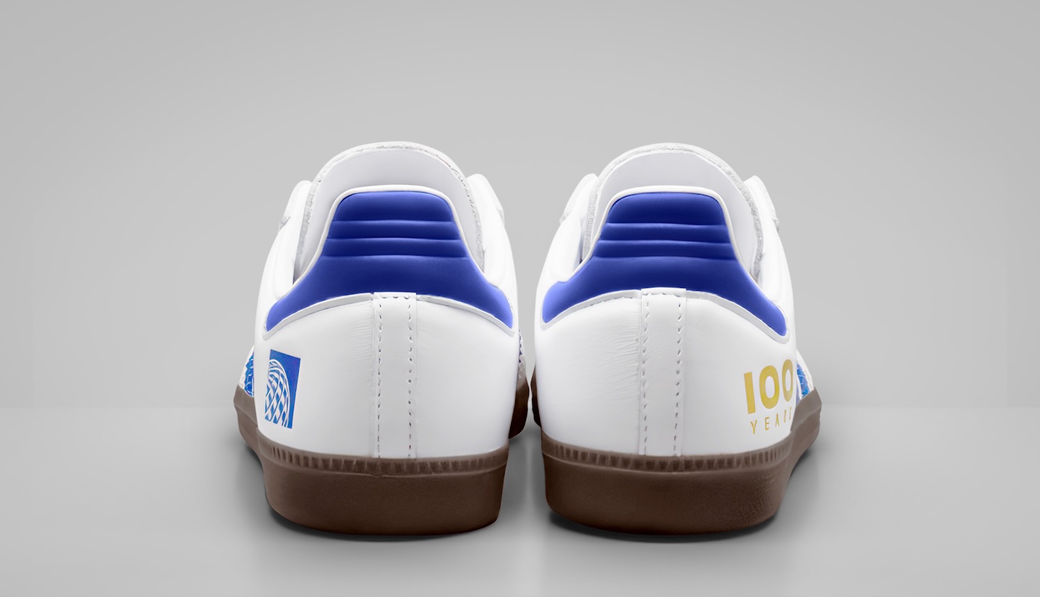 United has partnered with Adidas to produce a custom version of its mainstay Samba shoe, styled in “United Blue” with aviation-themed details. The sneakers feature United branding on the heel, including the globe logo on the left shoe and a gold “100 years” mark on the right.
