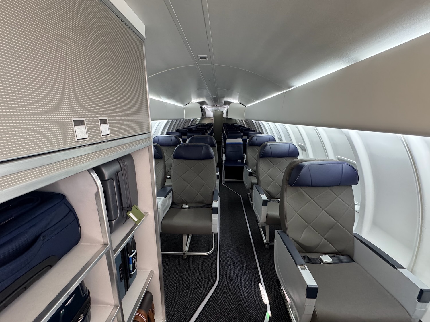 Unlike the first class cabin, the economy class cabin has overhead bins and these are largest than you currently see on the CRJ200, with United promises they will be able to accommodate larger carry-on bags (though not enough for every passengers to bring one…gate checking will still be a thing).